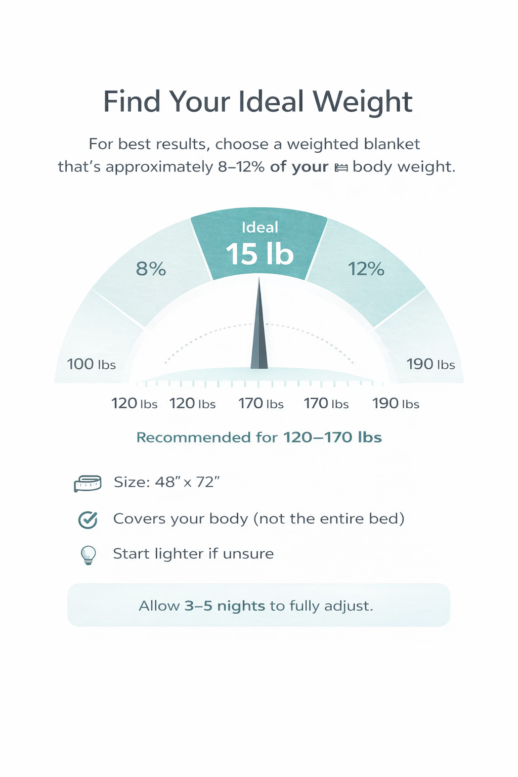 Choose a blanket that’s about 8–12% of your body weight. This 15 lb version is ideal for approximately 120–170 lbs. If you’re new to weighted blankets, allow 3–5 nights to adjust.
