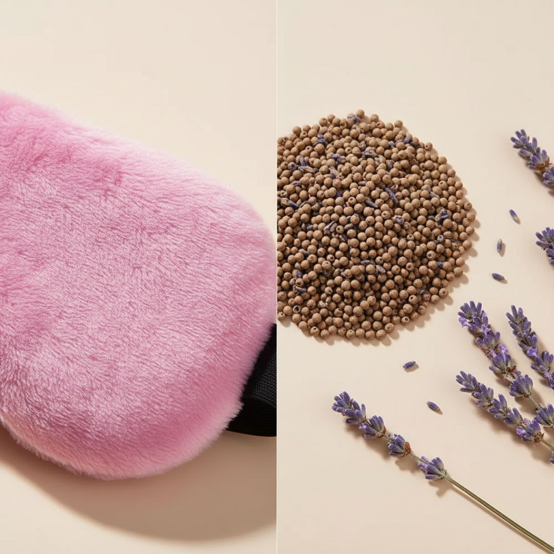 The inner pouch is filled with natural lavender and compression beads for aromatherapy and gentle pressure.
